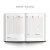 • Rozkład tygodniowy x52 (pusty obszar na każdy dzień, lista priorytetów, lista zadań, miejsce na wdzięczność, modlitwę, świadectwa chwały oraz notatki/werset tygodnia)